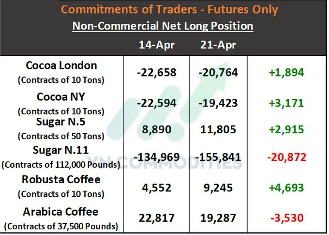 Báo cáo COT cho thấy vị thế của nhóm phi thương mại trên các thị trường hàng hóa có sự phân hóa rõ rệt. Với cacao, lực bán ròng vẫn còn nhưng đã thu hẹp, khi vị thế tại London tăng thêm 1.894 hợp đồng và New York tăng 3.171 hợp đồng. Ở nhóm cà phê, Robusta ghi nhận lực mua tăng mạnh thêm 4.693 hợp đồng, trong khi Arabica giảm 3.530 hợp đồng. Đáng chú ý, đường Sugar N.11 bị bán mạnh hơn, vị thế ròng giảm thêm 20.872 hợp đồng.