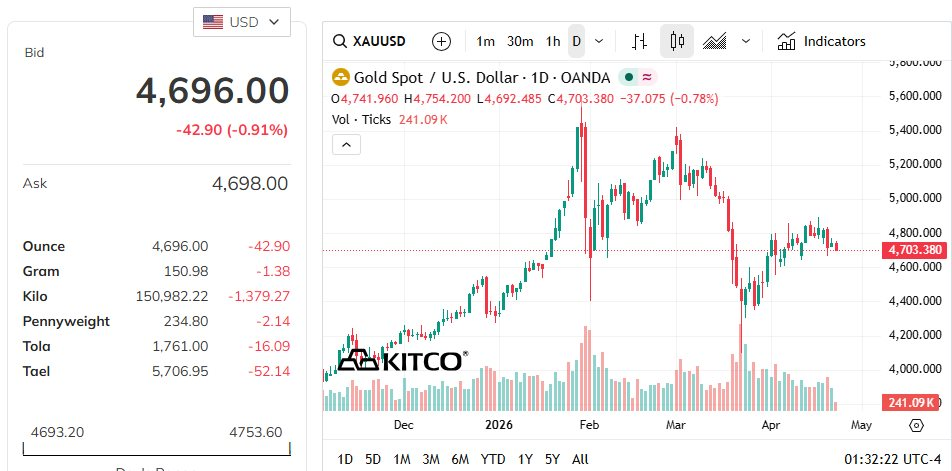 Trên thị trường quốc tế, giá vàng theo ghi nhận từ Kitco chốt phiên 22/4 ở mức 4.740,9 USD/oz, tăng 18,8 USD (tương đương 0,4%). Đây là nhịp hồi kỹ thuật sau khi kim loại quý này vừa trải qua phiên giảm mạnh gần 2% trước đó.