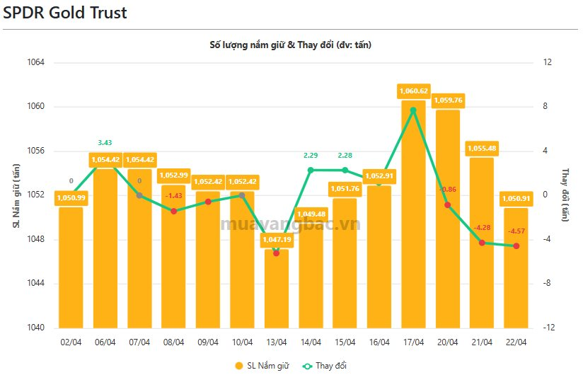Quỹ ETF vàng lớn nhất thế giới SPDR Gold Trust tiếp tục thu hút sự chú ý của thị trường khi đẩy mạnh bán ròng trong những phiên gần đây. Theo dữ liệu cập nhật từ Muavangbac.vn, riêng ngày 22/4, quỹ đã bán ra 4,6 tấn vàng, nâng tổng lượng xả trong 3 phiên liên tiếp lên 9,7 tấn. Động thái này khiến tổng lượng nắm giữ của quỹ giảm xuống còn khoảng 1.051 tấn.