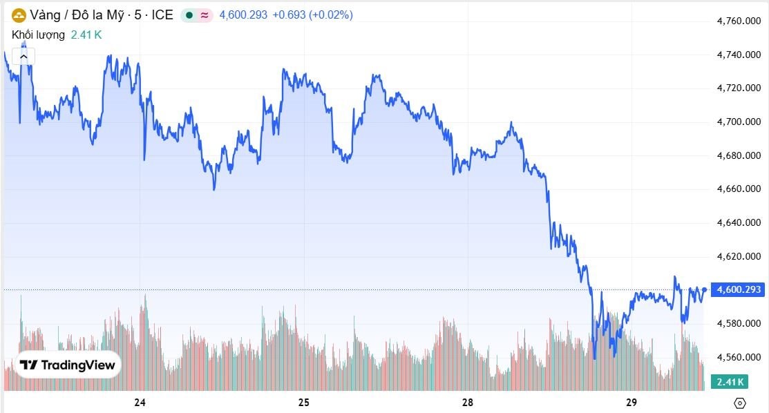 Trái ngược với dầu, giá vàng biến động trong biên độ hẹp khi nhà đầu tư chờ đợi tín hiệu rõ ràng hơn từ Fed. Giá vàng giao ngay tăng nhẹ 0,1% lên 4.597,07 USD/ounce, trong khi hợp đồng kỳ hạn tháng 6 đạt 4.610,20 USD, sau khi từng giảm về 4.581,40 USD.