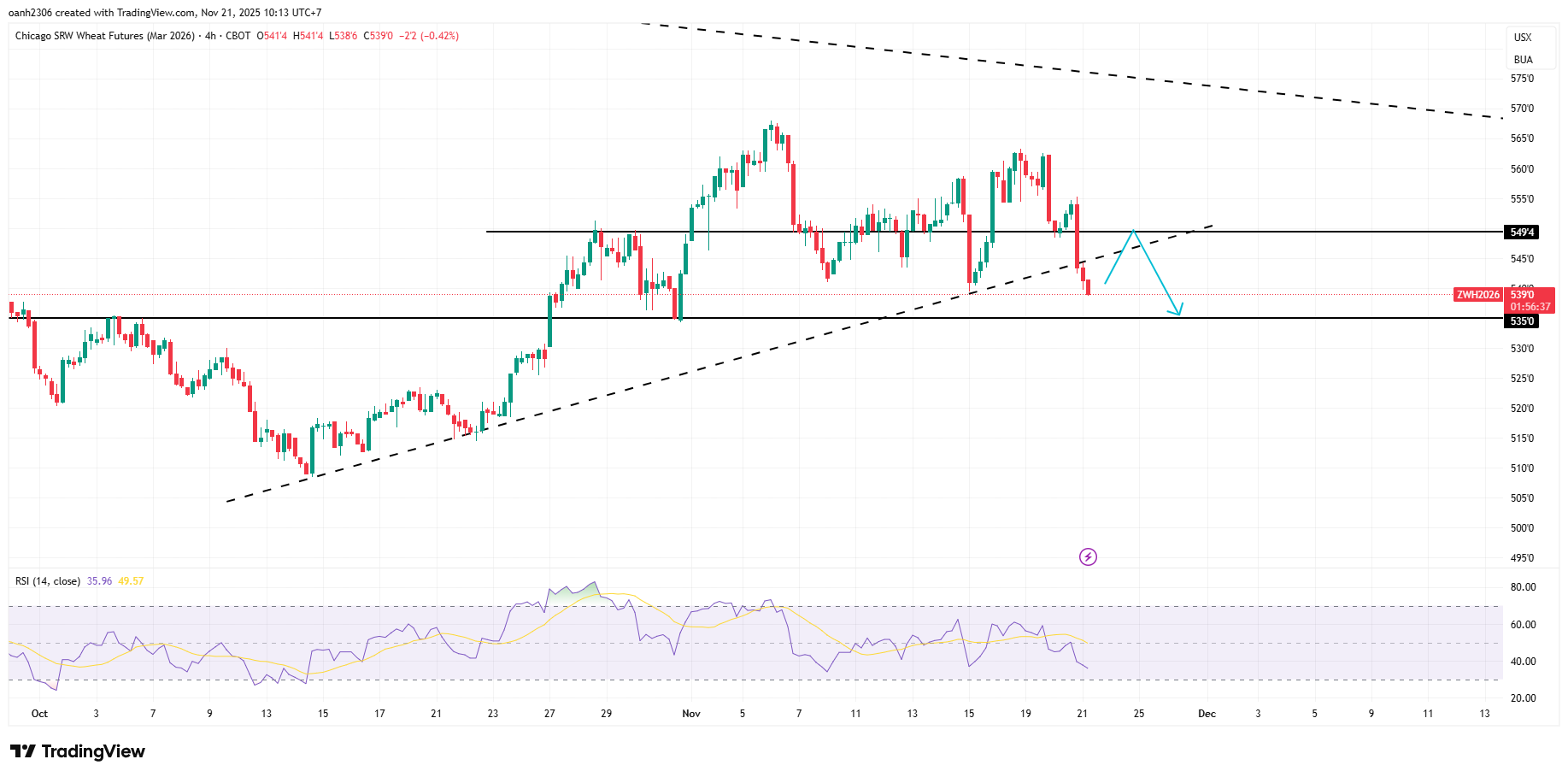 CẬP NHẬT LÚA MÌ CHICAGO (ZWH2026 – KỲ HẠN 03/2026) – H4 | Phá đường hỗ trợ của trend tăng ngắn hạn, có khả năng tiếp tục giảm về vùng hỗ trợ mạnh – 21/11/2025