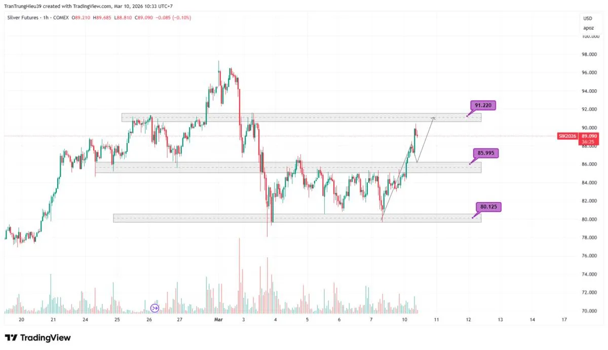 Hiện tại, giá Bạc đang tiệm cận vùng kháng cự quan trọng 90–91. Nếu lực mua đủ mạnh để phá vỡ và duy trì trên vùng này, giá Bạc hoàn toàn có thể mở rộng đà tăng lên các vùng mục tiêu 96–97, thậm chí 100 trong thời gian tới.