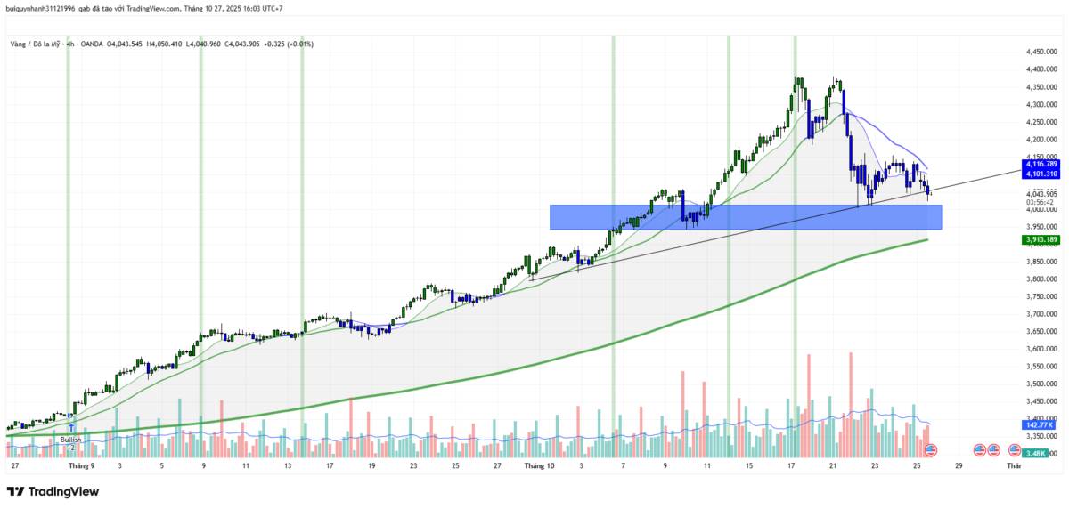 Sau hành trình tăng gần 60% kể từ đầu năm, giá vàng đã lập đỉnh lịch sử quanh 4.381 USD/oz, trước khi giảm sốc hơn 6% chỉ trong một ngày (21/10/2025) ghi nhận một cú sụt mạnh nhất kể từ năm 2013. Tính đến ngày 27/10/2025, vàng đang dao động quanh vùng 4.050 - 4.100 USD/oz.